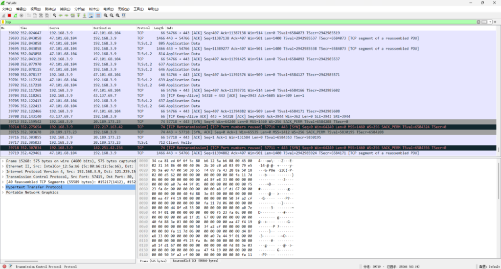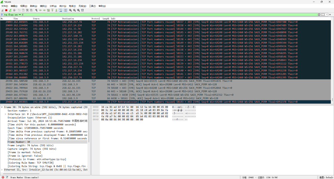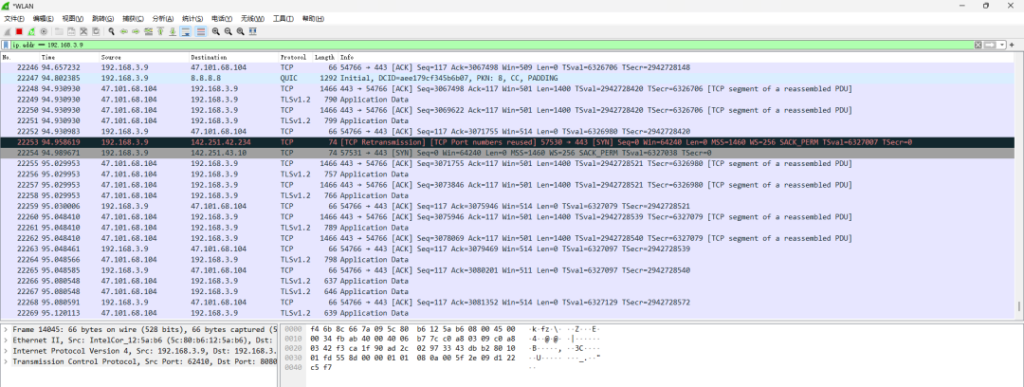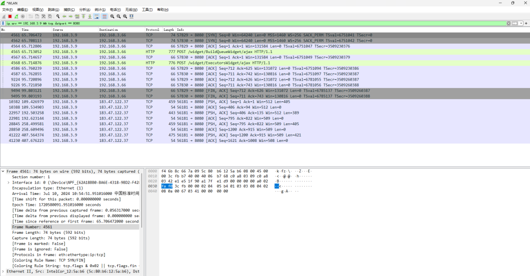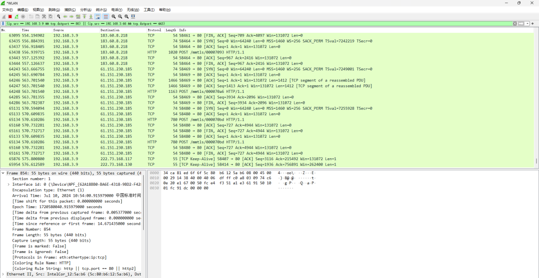 • 数据包列表:显示捕获的数据包,每个数据包一行,包含时间戳、源地址、目的地址、协议、长度等基本信息。