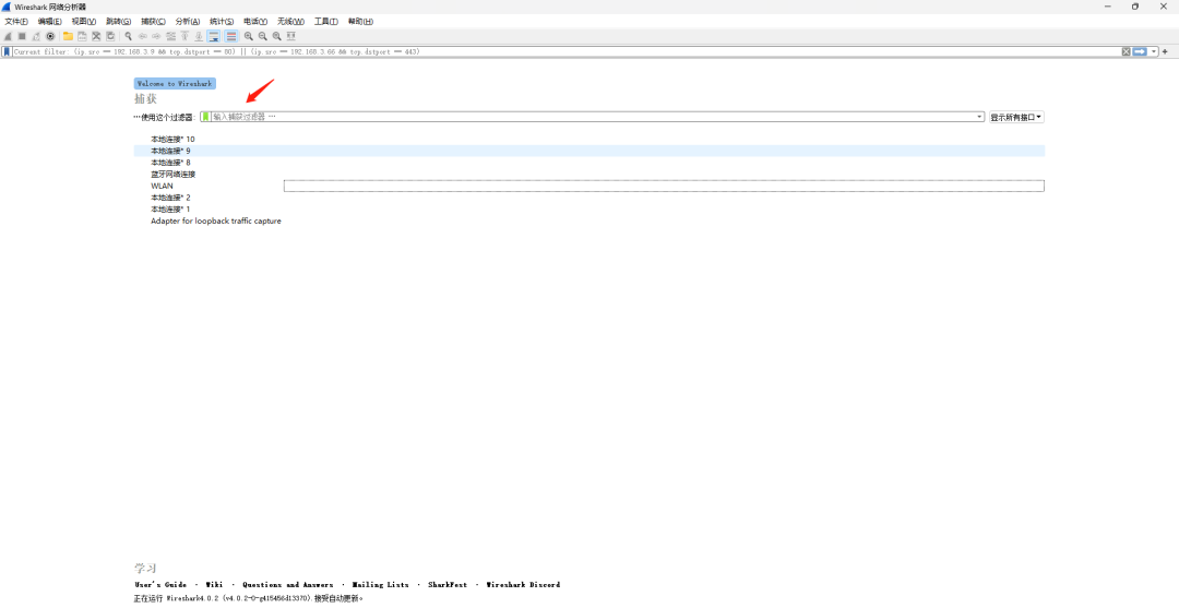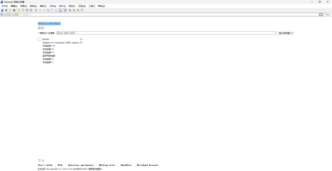 • 菜单栏:提供文件操作、编辑、查看、捕获、分析等选项,可以通过菜单访问各种功能。