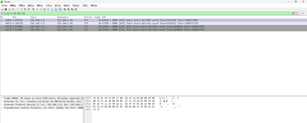 • 字节视图:以十六进制和ASCII格式显示选中数据包的原始字节数据,帮助用户查看数据包的实际内容。